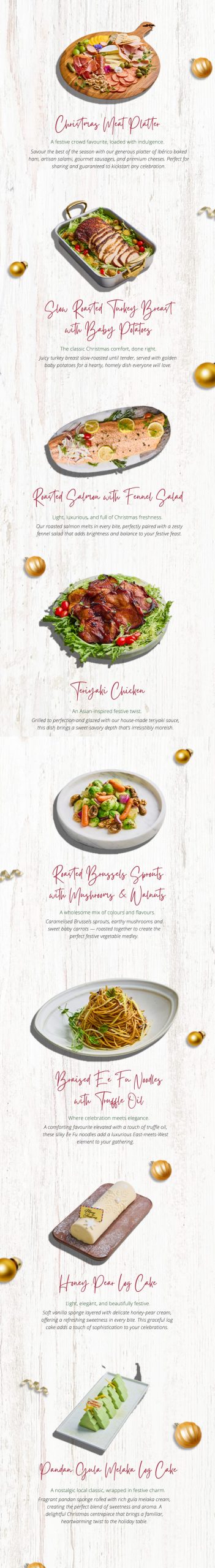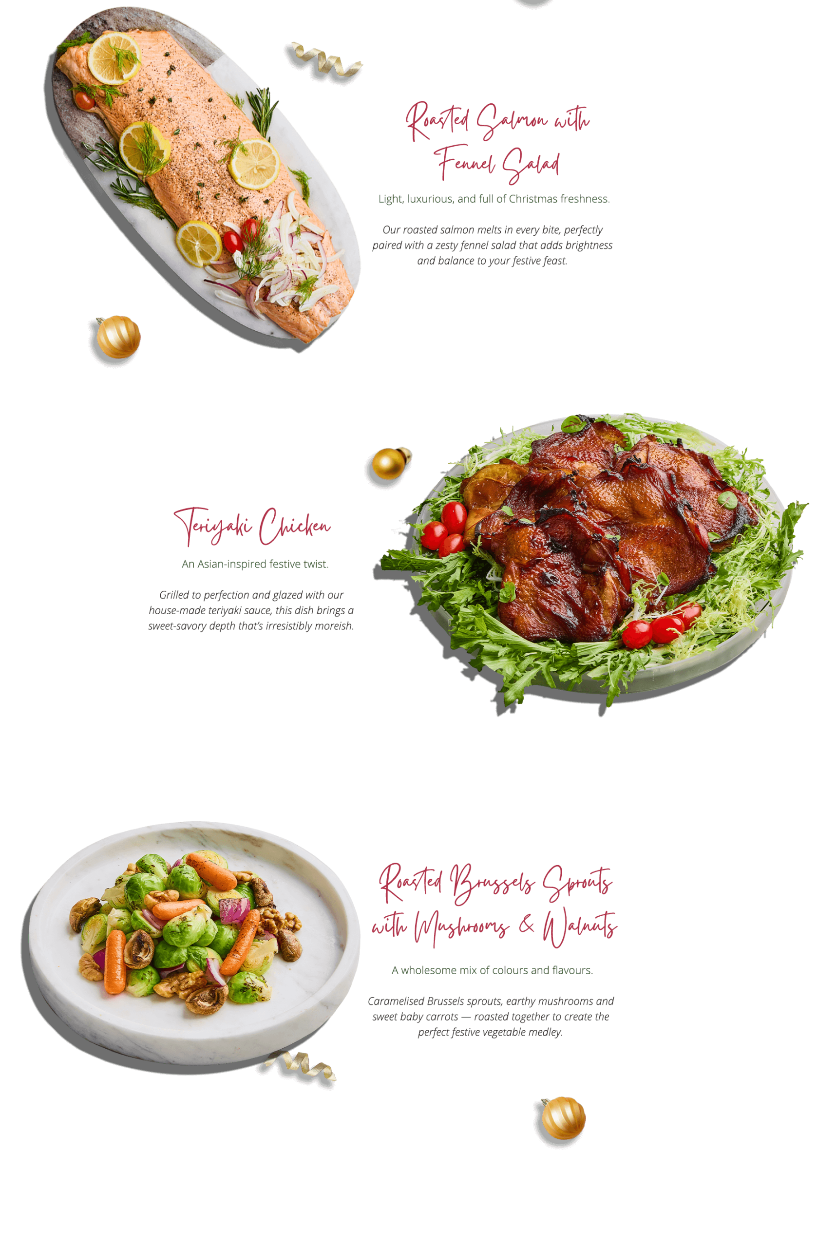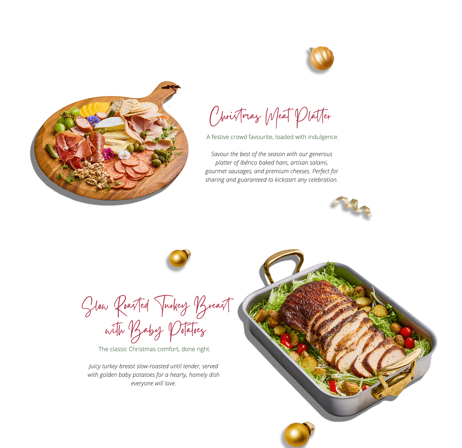 This the season to feast! Dive into a spread full of colour, flavour, and festive cheer as our chefs bring together both classic favourites and exciting new dishes. Thoughtfully prepared, each dish is designed to impress and bring joyous moments to your Christmas gathering. Whether it’s a cosy family dinner or a lively office party, our Christmas menu promises something for everyone.